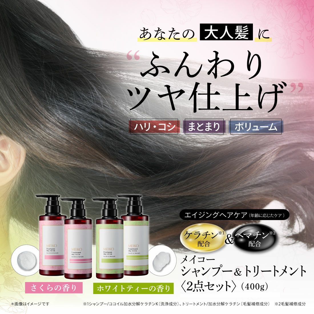 メイコー シャンプー・トリートメントは毛髪補修成分のヘマチンを配合。