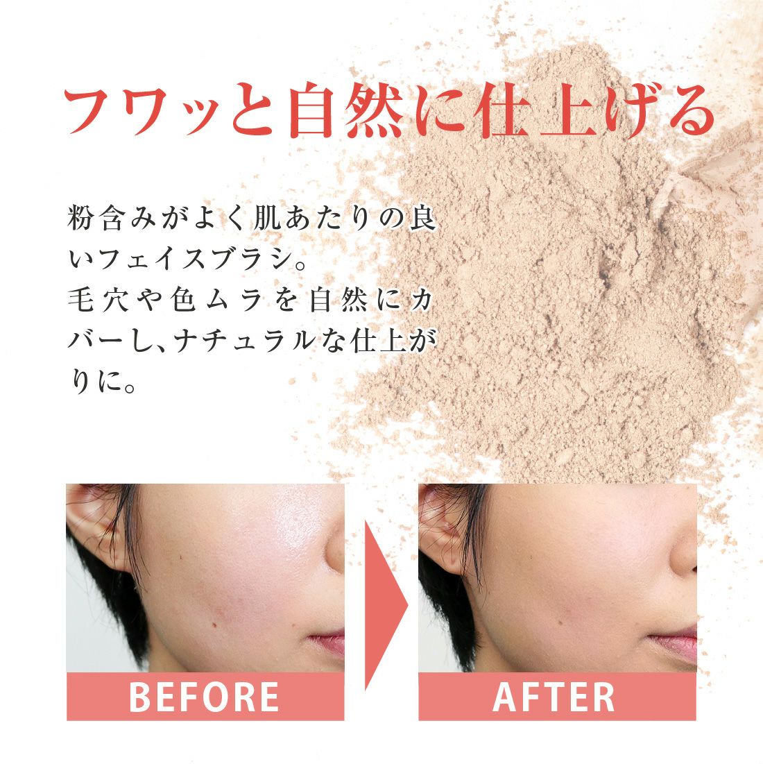 パウダー専用のフェイスブラシ。やさしくパウダーを均一に広げます。
