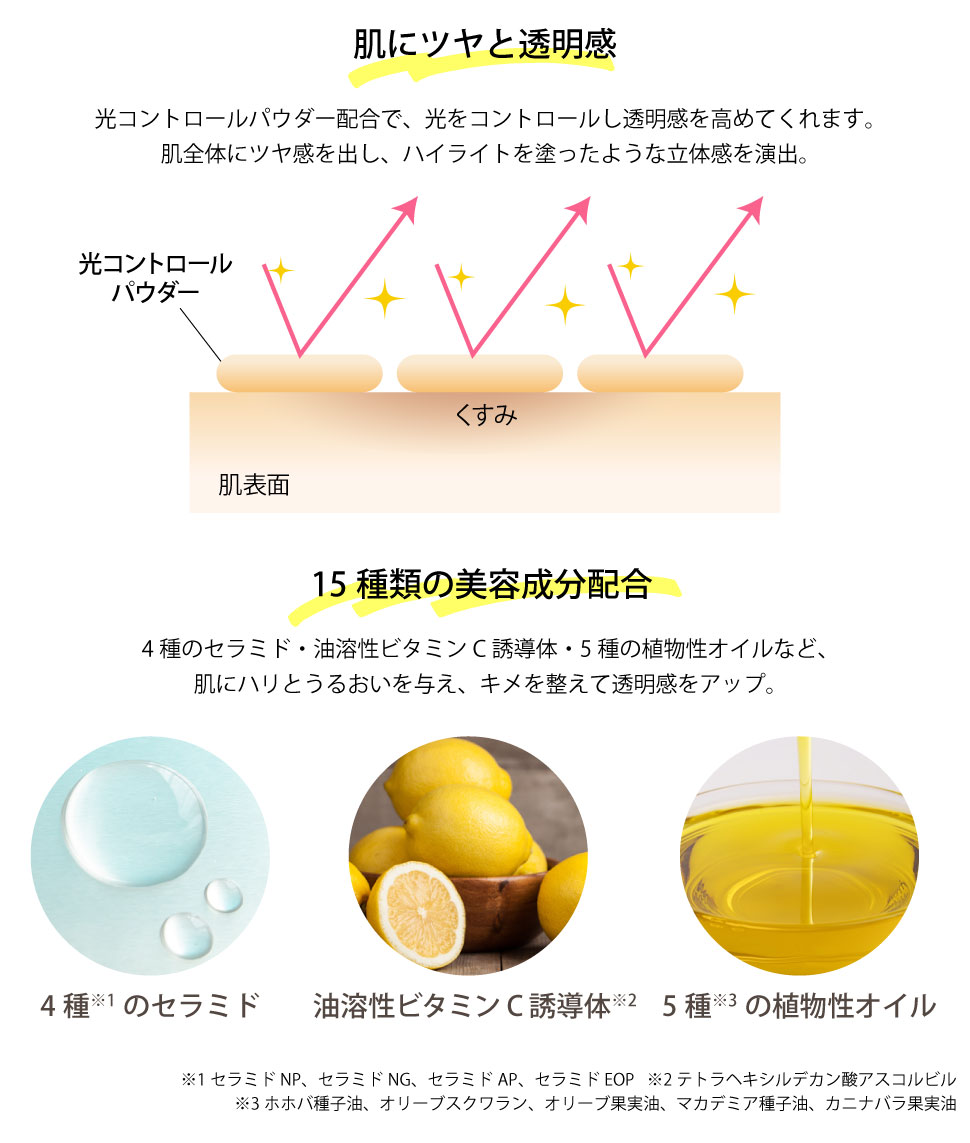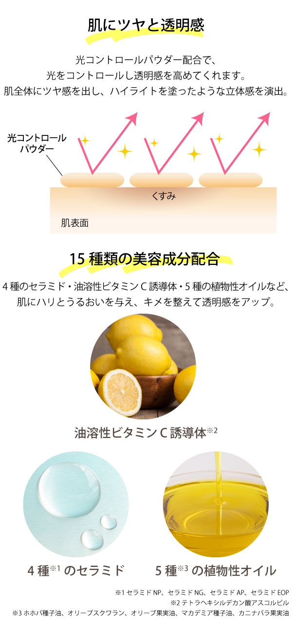 油溶性ビタミンC誘導体をはじめとする保湿成分配合で、しっとり感を与えながら肌悩みをカバー。