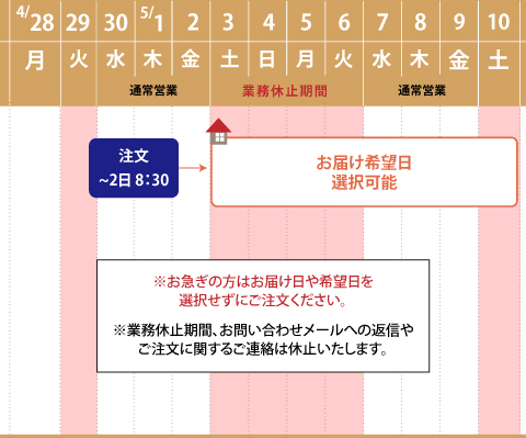 - 5月3日(土)に商品の到着を希望される方は、ご注文方法によって注文締切が異なりますので、ご注意ください。