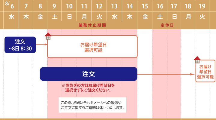 8月9日(土)に商品の到着を希望される方は、ご注文方法によって注文締切が異なりますので、ご注意ください。