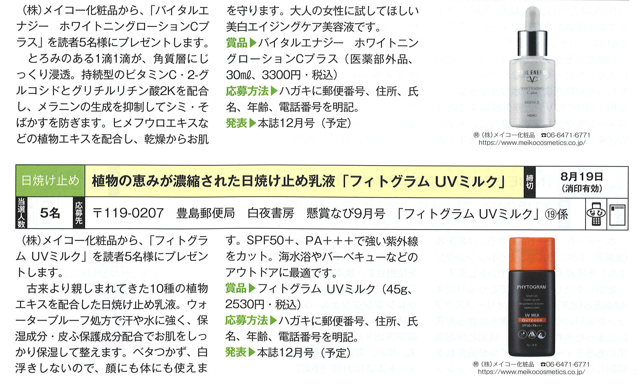 懸賞専門誌『懸賞なび2021年9月号』に「バイタルエナジー ホワイトニングエッセンスCプラス」と「フィトグラム UVミルク」が掲載されました。