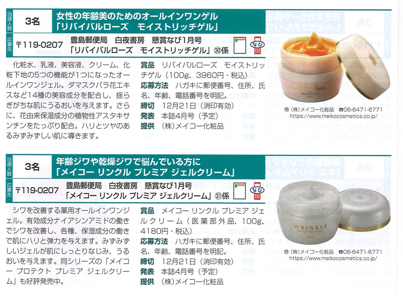 懸賞専門誌『懸賞なび2024年1月号』に「リバイバルローズ モイストリッチゲル、メイコー リンクル プレミア ジェルクリーム」が掲載されました。