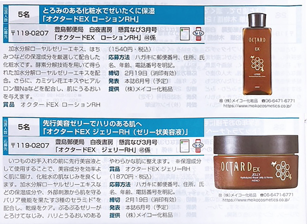 懸賞専門誌『懸賞なび2026年3月号』に「オクタードEX ローションRH、オクタードEX ジェリーRH(ゼリー状美容液)が掲載されました。