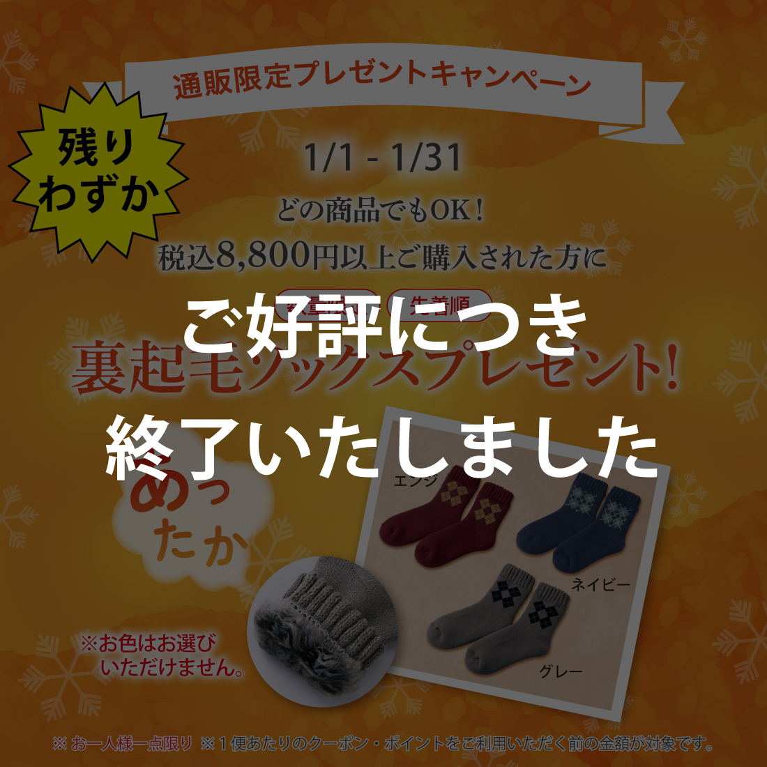 税込8,800円以上ご購入で裏起毛ソックスプレゼント